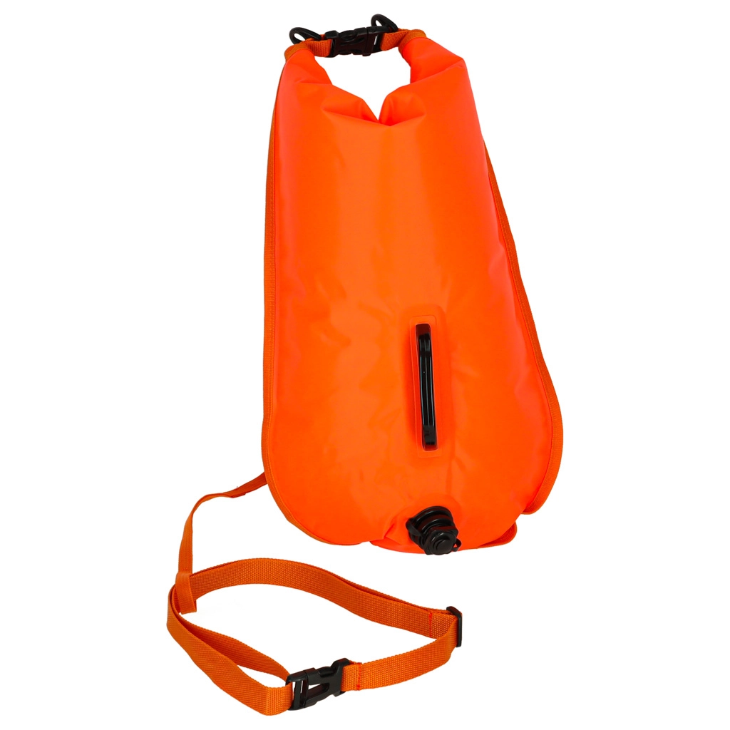 The swimming buoy is equipped with two independent air chambers with separate valves. This guarantees that if one chamber gets damaged, the other maintains the necessary buoyancy. It can be inflated with a pump or by mouth. Users will also appreciate the adjustable strap with a robust buckle, keeping the buoy securely attached to the body without hindrance during swimming.