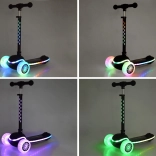 This three-wheel balance scooter is ideal for first outdoor rides. Lean-to-steer control helps children intuitively develop coordination and balance, while the wide, non-slip deck ensures confidence with every push. The front wheels, frame, and deck feature LED lighting with multiple switchable effects, and the built-in music module adds even more fun.