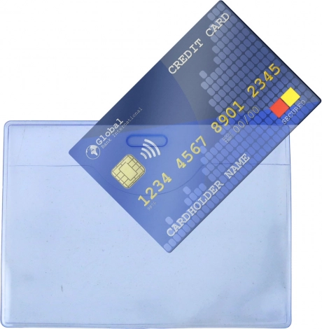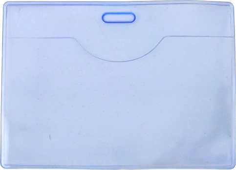 Transparent elastic blue horizontal ID card sleeve, protects documents and is ideal for offices and schools.