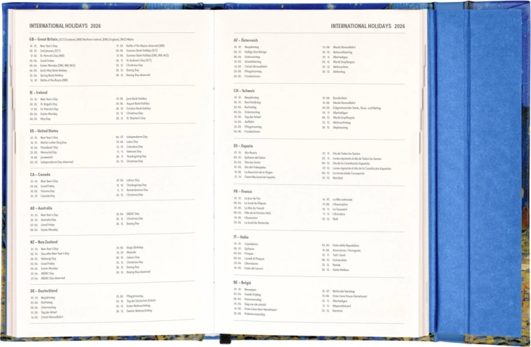 The diary is available in a size of 13 x 21 cm, which is the ideal size for a bag or backpack. It also includes international holidays, which is useful for users who travel often or have international clientele.