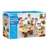The Woopie water and sand table shaped like a pirate ship turns the backyard into an adventurous cove. Kids can spray water from the cannon, send it down the slide, spin small and large water wheels, and blow soap bubbles. Thanks to stable legs and quality plastic, the table is durable, safe, and perfect for everyday play.