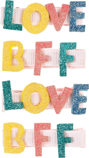 A set of four unique hair clips that create a stylish accessory for your child. Each clip features a metal part covered with grosgrain ribbon, enhancing its durability and elegance. Thanks to the lightly grooved grip, the clips stay securely in the hair and do not slip.