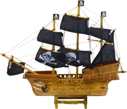 This model of a three-masted sailing ship in pirate style will capture the imagination of any ocean adventure enthusiast. Designed after legendary corsair ships from the 17th and 18th centuries, this model features a natural wooden hull with side cannon imitations and a distinctive stern and bow line. Black canvas sails featuring skull and crossbones prints and pirate flags give the ship an irresistible, characteristic appearance reminiscent of sea raiders and legendary freedom on the open sea.