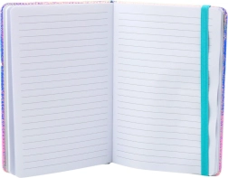 The center of the cover features a transparent shell filled with confetti in shapes of flowers and hearts that move freely with every motion. It's all finished with a contrasting colored elastic band that keeps the notebook closed and protects the pages from bending or accidental opening.