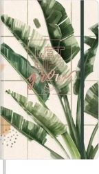 Enjoy the elegance of a notebook with a hard matte cover, adorned with a realistic motif of large green leaves on a light background. The centrally placed inscription 'Let life grow' adds a positive vibe and gentle energy.