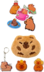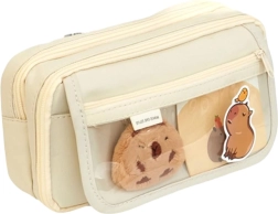 The pencil case is made of durable material that ensures long-lasting use. Its elegant beige color is suitable for various styles. It also includes a plus capybara that you can attach to the pencil case, backpack, or clothing. The accessory set also includes a capybara-themed keychain, two clips, and five capybara stickers.