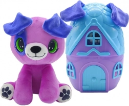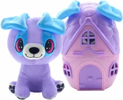 The collection includes adorable plush toys in colors like purple, brown, blue, yellow, and pink. Each toy comes with a little house for easy storage.
