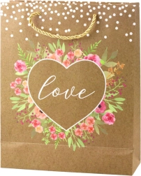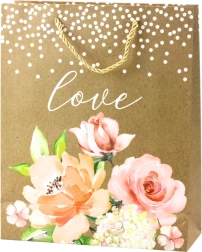 This gift bag boasts a delicate combination of beautiful, colorful flowers and the inscription "Love." Tiny brocade dots at the top of the bag add subtlety and lightness.