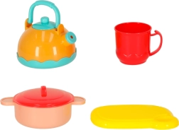 - Kitchen accessories (15 pcs): kettle, pot with lid, cutlery (large and small knife, spoon, fork), mug, cutting board, children’s hotplate/kitchen, basket.