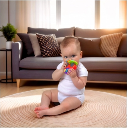 Three soft teethers with different textures provide relief during teething, while the compact shape of the keys is ideal for little hands. The toy naturally supports fine motor skills, hand–eye coordination, and early grasping abilities.
