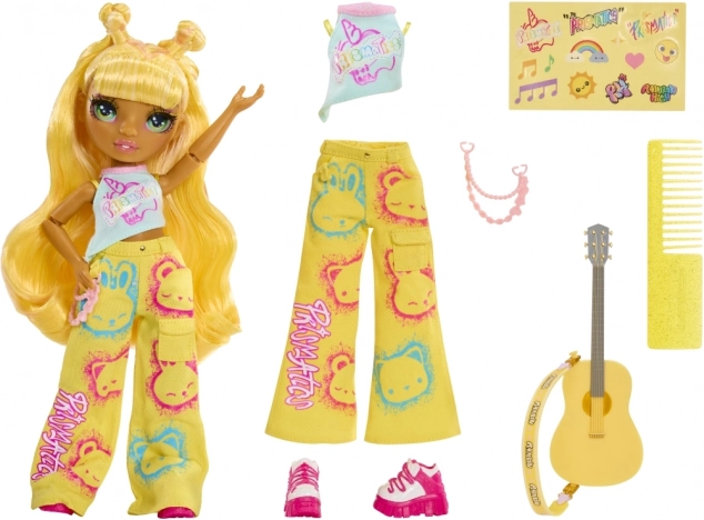 Light up your world with the Rainbow High Junior Fashion Sunny doll, approximately 23 cm tall. She brings an iconic yellow style, poseable joints for dynamic posing, and musical accessories including a yellow guitar and stickers for custom designs. Ideal for kids aged 4+ who love fashion, music, and creative play.