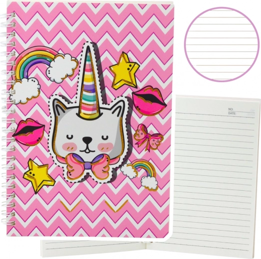 This stylish and practical notebook combines functionality with a playful design. The pink cover with a zigzag pattern and motifs like rainbows, stars, lips, and bows catches the eye and adds a touch of magic to every writing session. The main illustration is a cat with a unicorn horn, giving the notebook a fairytale vibe.