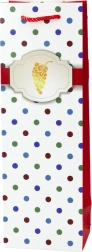 Thanks to its 35 × 12 × 9 cm dimensions, the bag is perfectly suited for bottles and other tall gifts. Available in a mix of patterns (white and black with colorful polka dots) featuring a bottle and glass or grape motif. Sold individually; motif is selected at random.