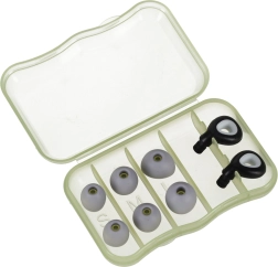 - 1× pair of earplugs (left and right), 6× silicone tips (S, M, L), 1× case, user manual