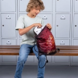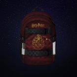 A stylish school set with a HARRY POTTER theme includes a lightweight, spacious Skate backpack, a practical pencil case, and a durable drawstring bag for shoes/sports. The backpack made of recycled water-repellent material offers 3 compartments, an organizer, and a padded pocket for a 15" laptop, plus reflective elements, YKK zippers, and straps for a skateboard. The pencil case and bag match the wine red Hogwarts design with the crest and the Golden Snitch.