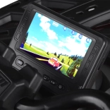 For young drivers, there is a two-piece padded eco-leather seat with belts and passenger handholds, a smooth start without jerking, and LED lights front and rear for better visibility. The multimedia LED panel offers built-in melodies, USB, MP3, FM radio, and an SD card slot. A practical parent pull handle lets you tow the quad when the battery is empty.