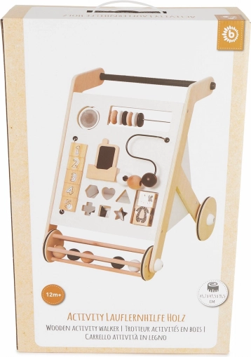 The stylish Bieco wooden walker in a black-and-white design combines first steps with discovering the world. It offers 7 fun activities to develop fine motor skills, coordination, and sensory perception. Thanks to the stable wooden construction, ergonomic handle, and non-slip rubber wheels, it ensures safe and smooth movement across the floor.