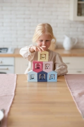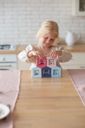 Discover the creative CUBIKA wooden building set in soft pastel colors with 30 elements, including blocks with emojis. Build six houses, each with its own resident in the matching color – children naturally practice color recognition, fine motor skills, and logical thinking while playing. The toy is made from high-quality maple and beech, uses safe water-based paints, and meets the EN 71 standard. 30 pieces, pastel colors, color learning, safe materials, from 24 months, made in Europe.