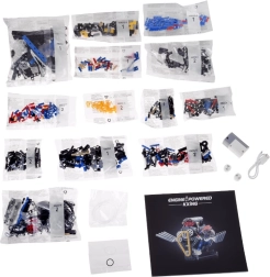 It includes numbered bags for easy sorting, a USB charging cable, and a clear illustrated manual. The striking red light gives the model an impressive look and highlights the moving parts.