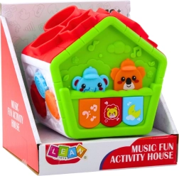 The interactive educational house is a multifunctional toy that supports fine motor skills, logical thinking, and hand–eye coordination. Each wall hides a different activity: shape sorter, colorful piano, sliding animals, rotating gears, and a little door with a key. Thanks to the illuminated keys and cheerful melodies, kids love to come back to play, practicing patience and focus.