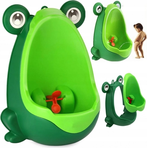 FreeON Frog children’s urinal in green with suction cups, adjustable height, and a spinning target. Easy to clean, durable plastic—ideal for training boys.