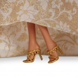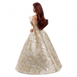 This festive Barbie enchants with long brown hair, statement earrings, and a gorgeous gown inspired by ballroom fashion. The rich skirt with a gold-and-white pattern, tulle details, and a bold bow exude luxury and look stunning both during play and when displayed on a shelf.