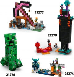 Includes minifigures like Alex with a Creeper sweater, Steve with a winter sweater, Creeper, a drowned with a trident, a stray in diamond armor, a snow golem, a zombie with an enchanted axe, and a villager in a Santa costume with a furnace. In total you get 300 pieces that are compatible with other LEGO MINECRAFT sets.