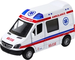 - 1:32 ambulance with pull-back drive, 3× AG13 batteries, manufacturer’s packaging