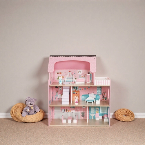 It comes with a complete furniture set, so children can immediately furnish the rooms and develop their imagination. The product complies with European standards and is made from eco-friendly wood, making it a responsible choice for both family and planet.