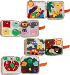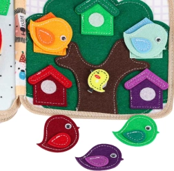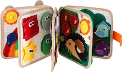 This sensory and educational book made of soft felt offers children a fun way to learn. Removable and movable elements with hook-and-loop or snap fasteners encourage interaction, train hand–eye coordination, and develop fine motor skills. With vibrant colors and varied themes, children learn to recognize colors, shapes, animals, and phenomena in nature.