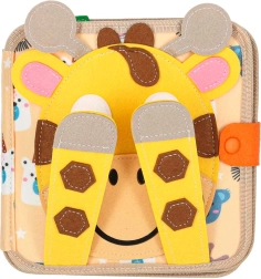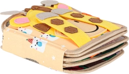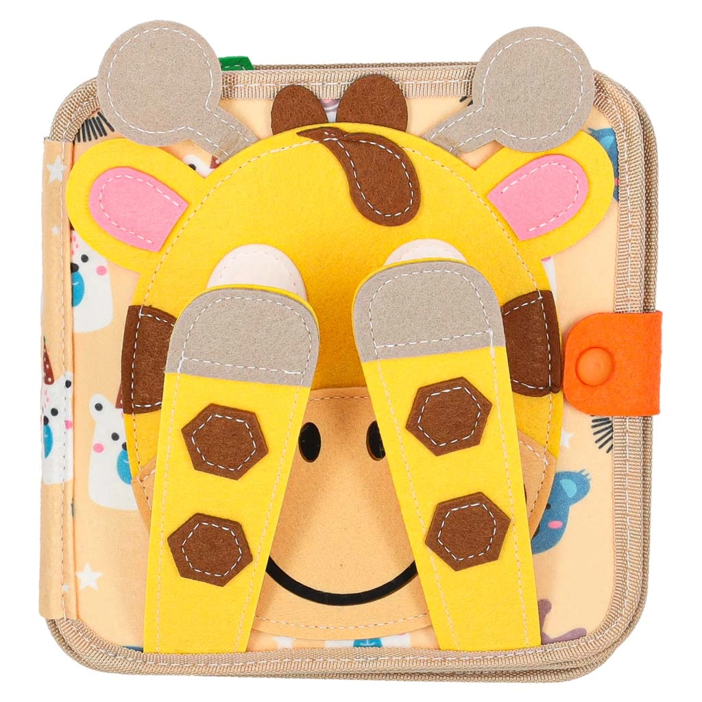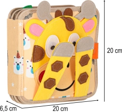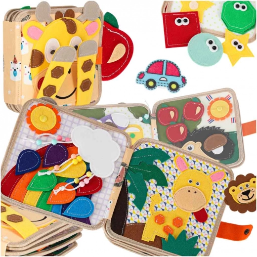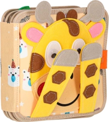 Discover a playful felt book that develops fine motor skills, imagination, and the recognition of colors and shapes. Thanks to the soft sensory elements, removable pieces with hook-and-loop and snap fasteners, and a travel-friendly format, kids will love it. A cheerful giraffe guides children through pages full of activities that support learning through play.