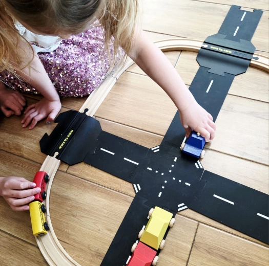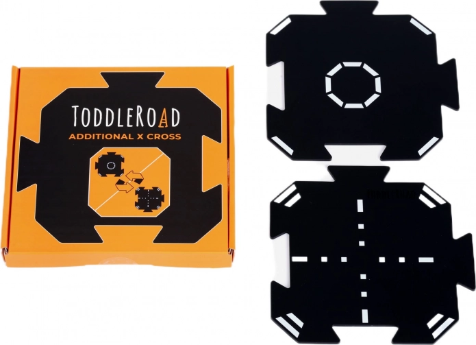A practical addition to the City and Metropolis sets brings a universal solution with double-sided pieces: on one side a small roundabout, on the other an X-intersection. This lets kids easily change direction, connect routes, and create new play scenarios at home or outdoors.