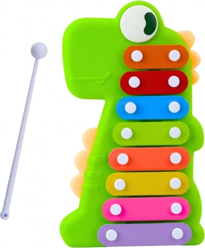 Children’s xylophone in the shape of a green dinosaur with 8 tones. Safe, colorful, and durable; supports motor skills, rhythm, and creativity. Includes mallet.