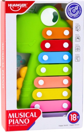 The xylophone is made of durable plastic and metal, has rounded edges, and is comfortable to hold. The attractive look of the green dinosaur motivates regular play and naturally develops coordination skills, auditory perception, and creativity.