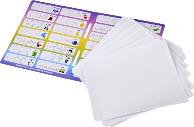 Includes a connected stylus/brush, a compact base for easy storage, and a set of white cards for repeated practice following simple templates.