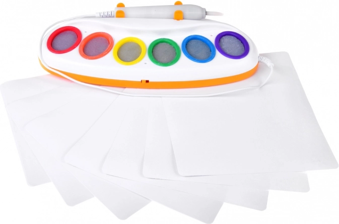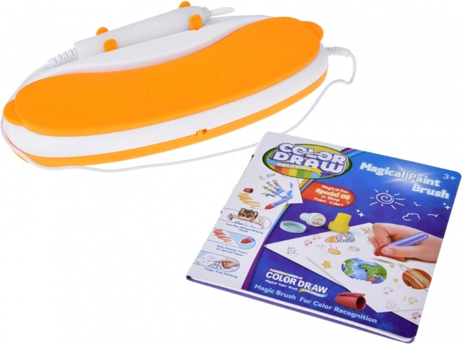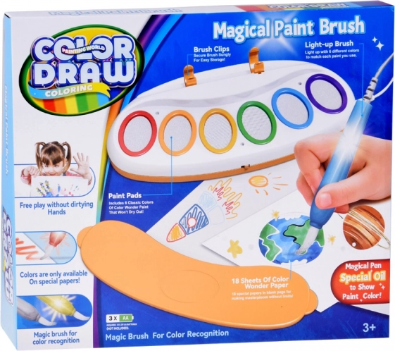 The electronic LED brush lets kids draw and color on special paper without a drop of water and without stains on clothes or the table.