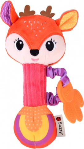 Soft fabrics and a ribbed handle make it easy to hold and shake, supporting fine motor skills and hand–eye coordination.