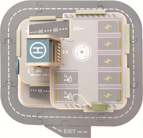 Discover a fun and educational wooden garage with a road, elevator, and helipad that introduces kids to the world of transport. It includes 3 levels, 4 cars, a helicopter, a car wash, fuel pumps including an EV charger, and traffic signs. It supports creativity, imagination, and fine motor skills for children aged 3 and up.