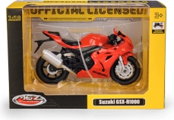 The red SUZUKI GSX‑R1000 in 1:18 scale is a faithful replica of a sport motorcycle with precise detailing. Metal and plastic parts, realistic fairings, and printing ensure an attractive look for both display and play.