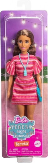 Discover the magic of the movie BARBIE and TERESA: Recipe for Friendship with the Teresa doll in a pink dress, white ankle boots, and turquoise accessories. With poseable limbs, an easy-to-remove outfit, and stylish accessories, it inspires fashion makeovers and creative play. Great for children aged 3 and up.