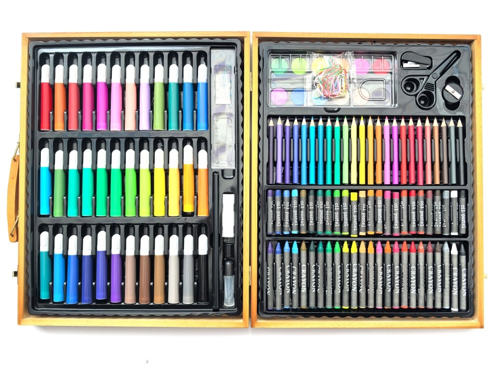 - 24 crayons, 24 oil pastels, 24 colored pencils, 12 watercolor paints, palette, 36 markers, sharpener, eraser, black pencil, stapler, scissors, glue, ruler, 20 paper clips