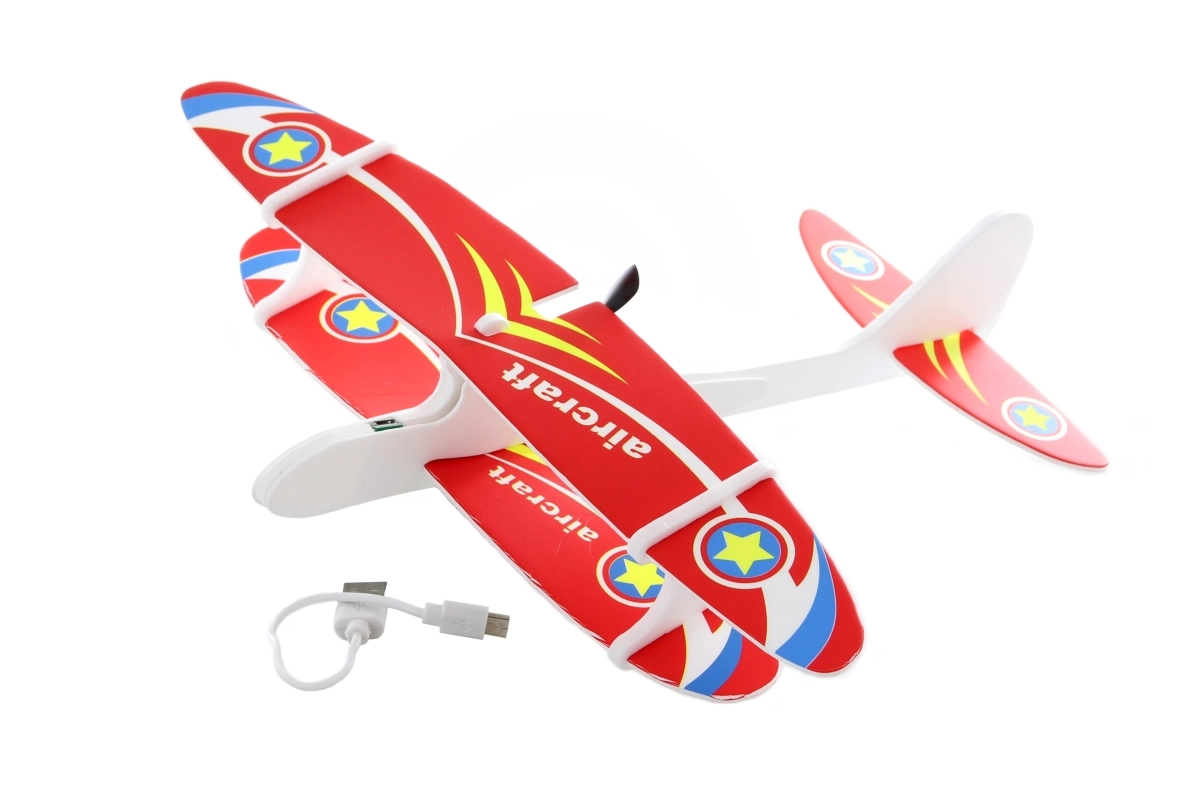 A lightweight polystyrene airplane model with USB charging that delights pilots young and old. After simple assembly it lights up, plays flight sounds, and thanks to its low weight it flies great. A USB cable is included; a charger is not included.