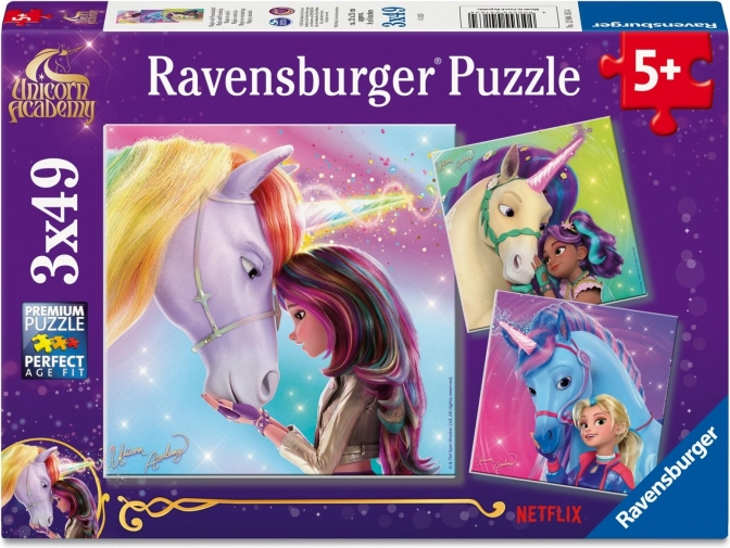 RAVENSBURGER puzzles 3×49 pieces UNICORN ACADEMY. Anti-reflective surface, SoftClick technology, durable pieces. Great fun for kids aged 5+.