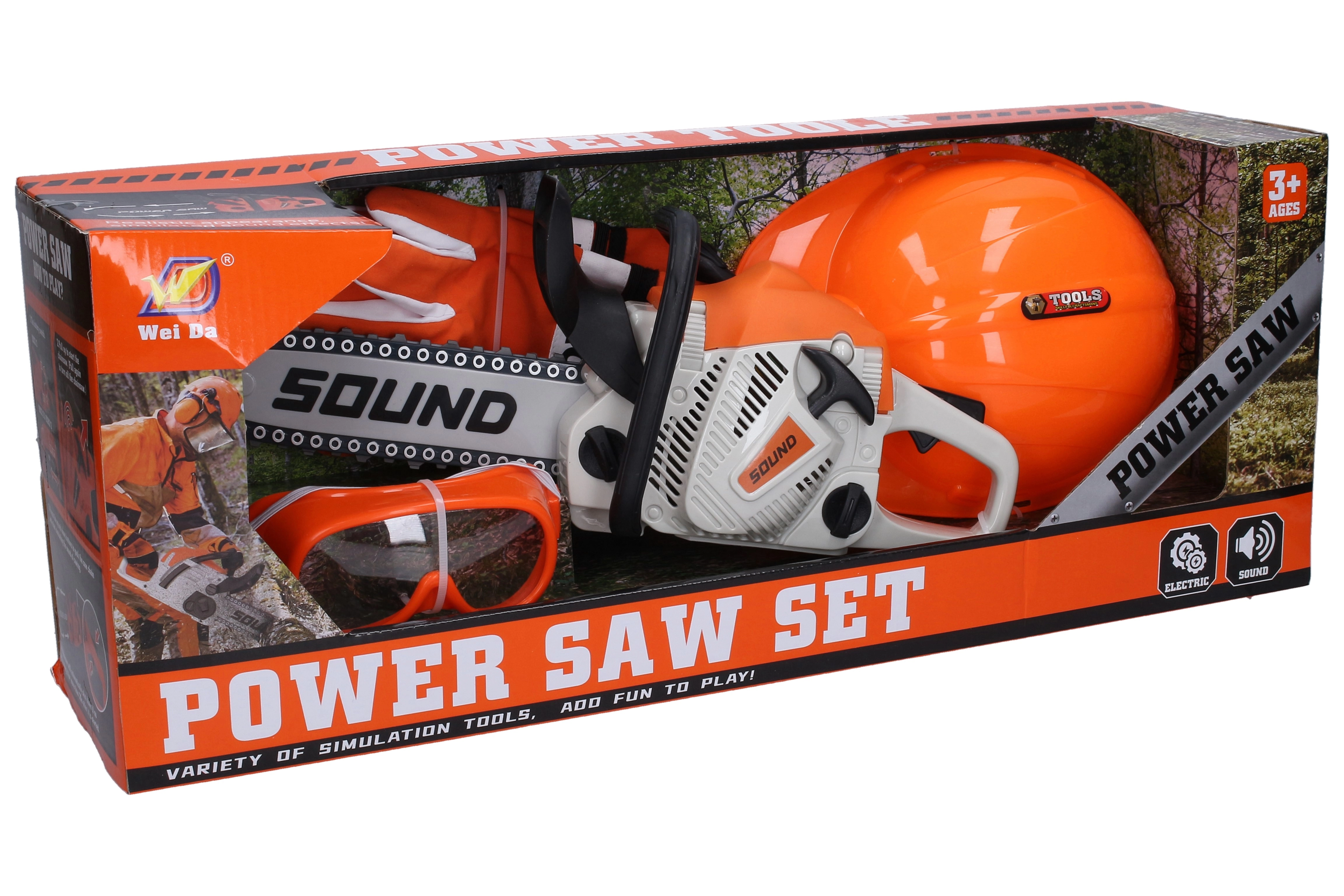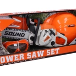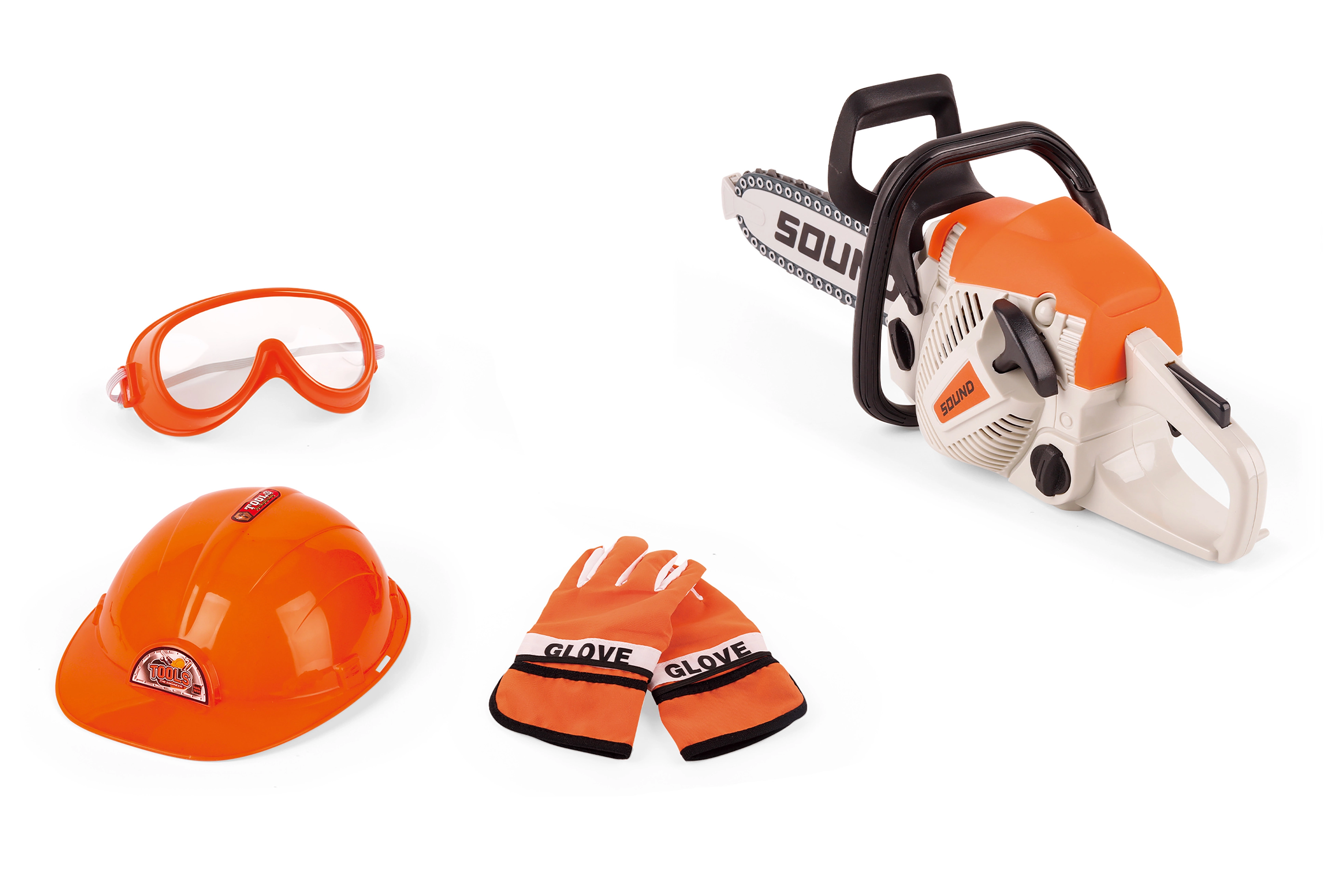 - Toy chainsaw, helmet, gloves, safety goggles