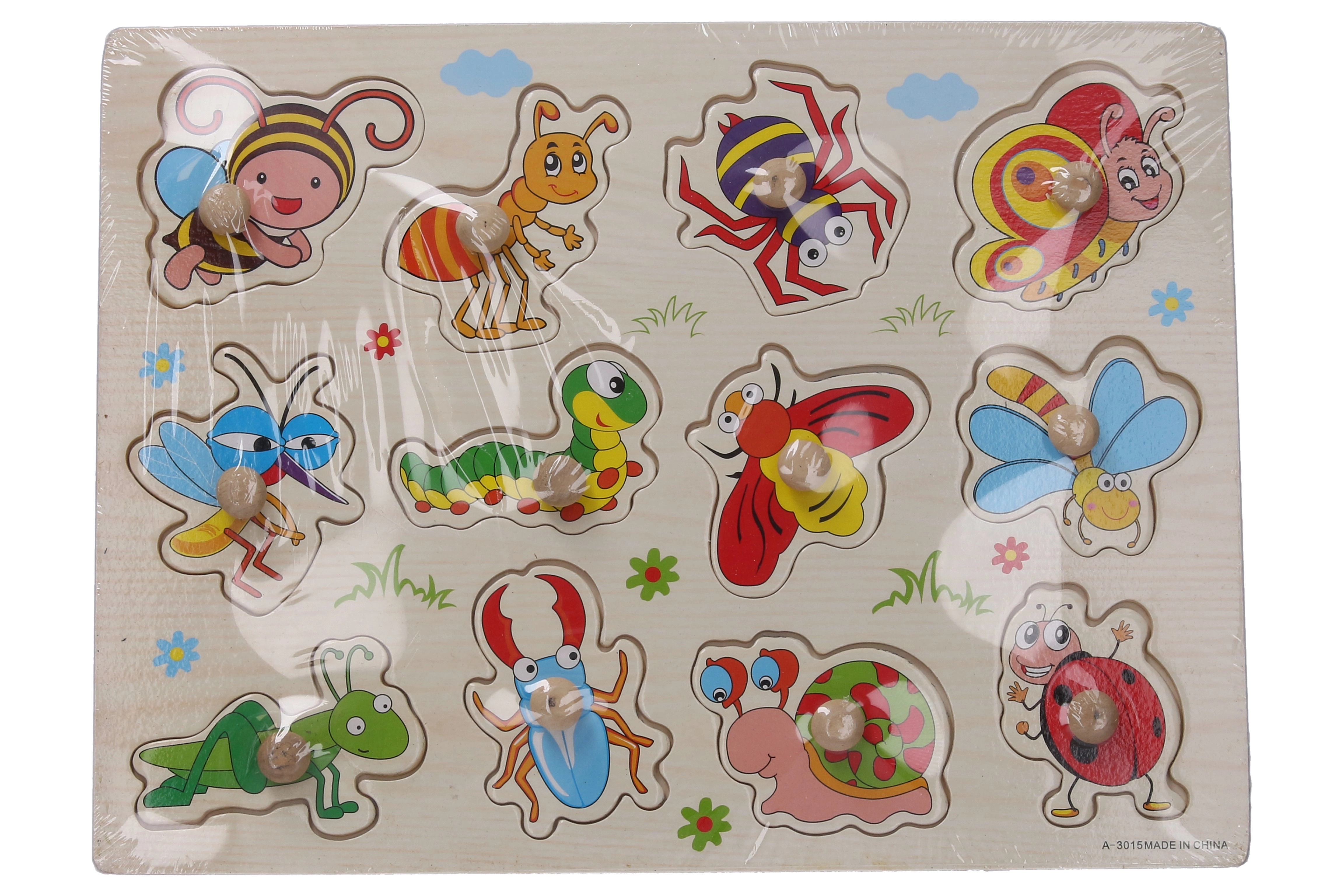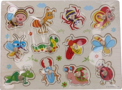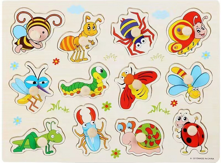 Discover a fun and educational toy for the little ones: a wooden insect-themed puzzle board measuring 30 × 22.5 × 1 cm. It helps develop fine motor skills, logic, and recognition of shapes and animals.