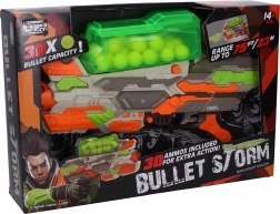 A fun action toy for small and big shooting enthusiasts alike: the Bullet Storm blaster with foam balls and a range up to 23 m delivers safe, dynamic play. The package includes 30 foam balls, a clear illustrated manual, and a practical prime mechanism with a trigger safety for safer use.