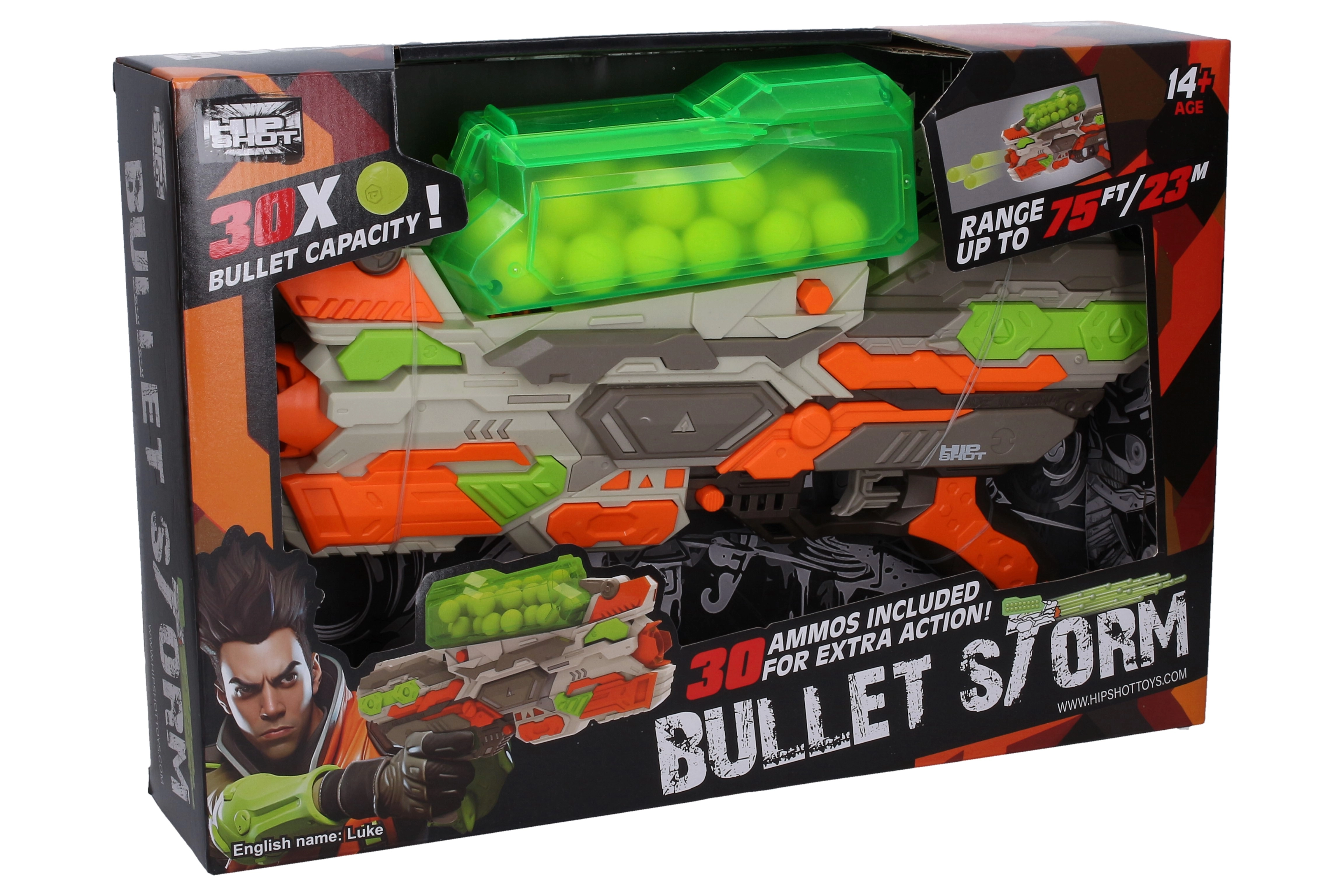 Get ready for action with the Bullet Storm blaster that combines safety and performance. With a range up to 23 meters and a supply of 30 soft foam balls, you’ll enjoy hours of play indoors and outdoors. Its robust build and comfortable grip ensure easy, confident handling.