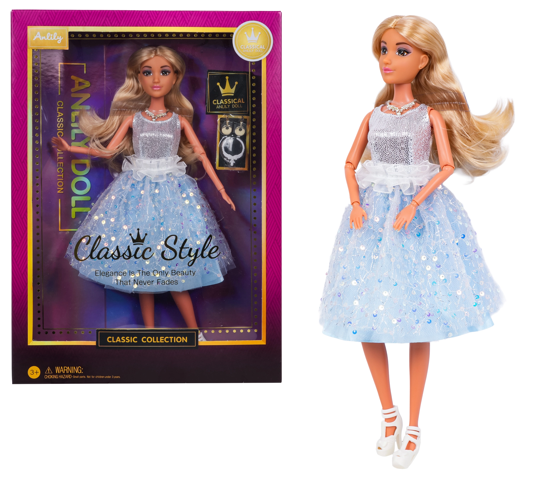 The set also includes elegant accessories—earrings and a necklace—helping children develop imagination and fine motor skills. The doll is a great choice as a birthday or Christmas gift and perfectly complements any collection of fashion dolls.