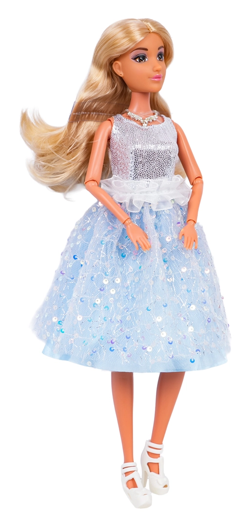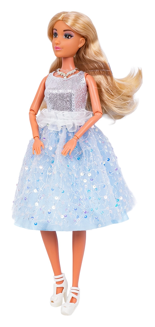 This stylish doll for children aged three and up is made from quality materials with attention to detail. She features realistic, long, silky hair suitable for brushing and braiding, a glittery evening dress, and white high-heeled shoes. Movable limbs with elbow and knee joints enable natural poses and make fashion shows or ballroom play even more fun.