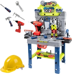 A fun and educational kids' workbench with a 2-in-1 carry case offering up to 133 pieces for endless creative play. Includes a battery-powered electric screwdriver, hand tools, a safety helmet, and construction elements. Children develop fine motor skills, logical thinking, and imagination while role-playing a real workshop.